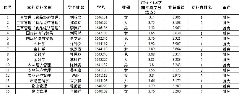 根据beat365官方网站《2020年推荐优秀应届本科毕业生免试攻读硕士学位研究生工作实施办法》和《beat365官方网站2020年推荐优秀应届本科毕业生免试攻读硕士学位研究生工作实施细则》规定,对2016级29位申请人进行综合排名后,最终确定以下15人具备免试攻读硕士研究生资格,名单如下: